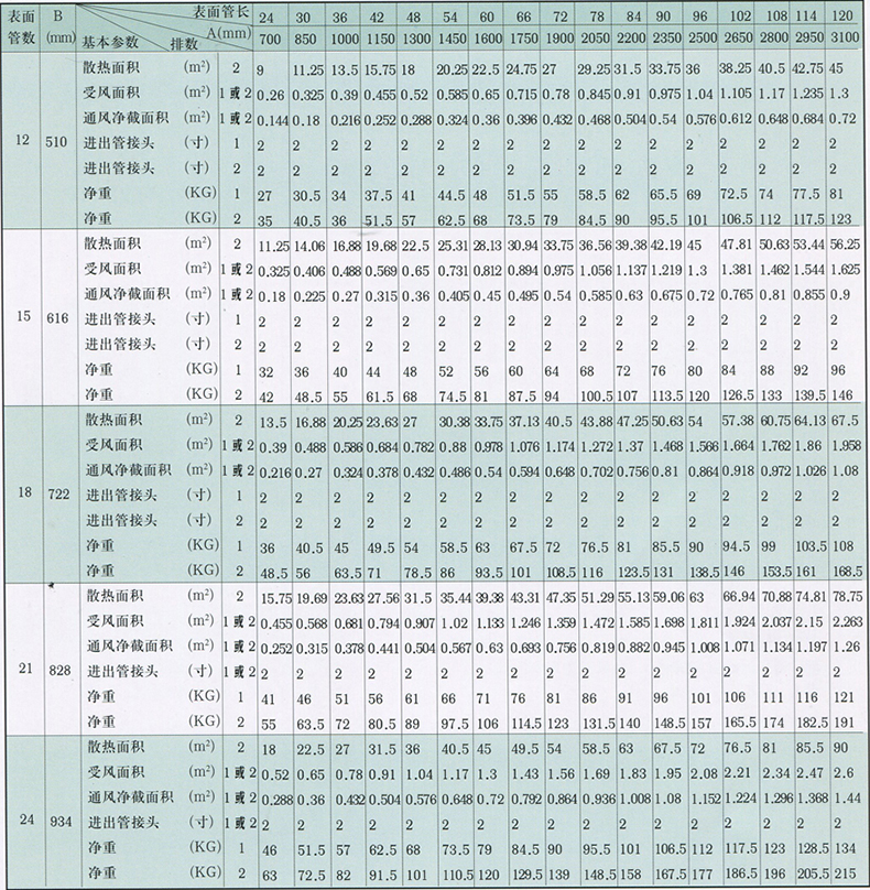 UⅡ型不銹鋼翅片管散熱器有各種不同表面管長、管數(shù)、排數(shù)及翅片片距的多種配合,計有大小規(guī)格七百六十五種。